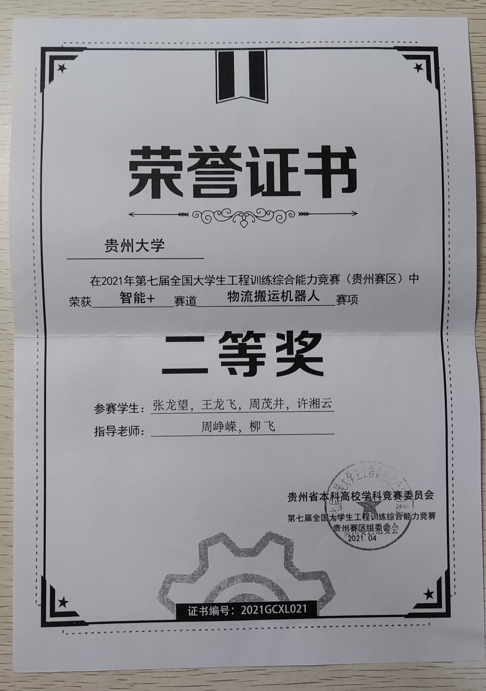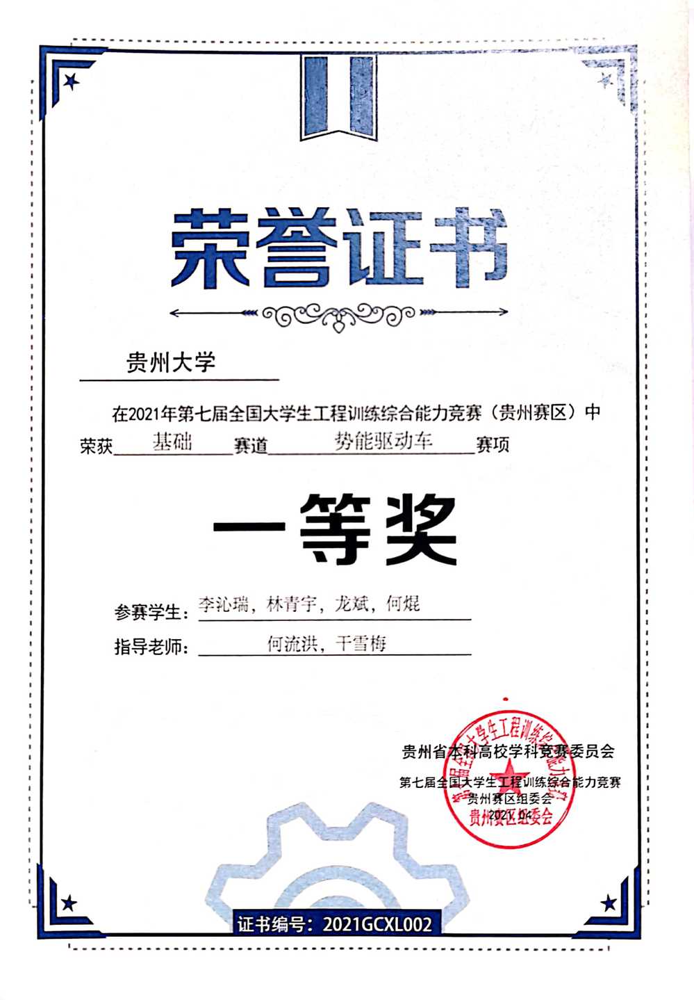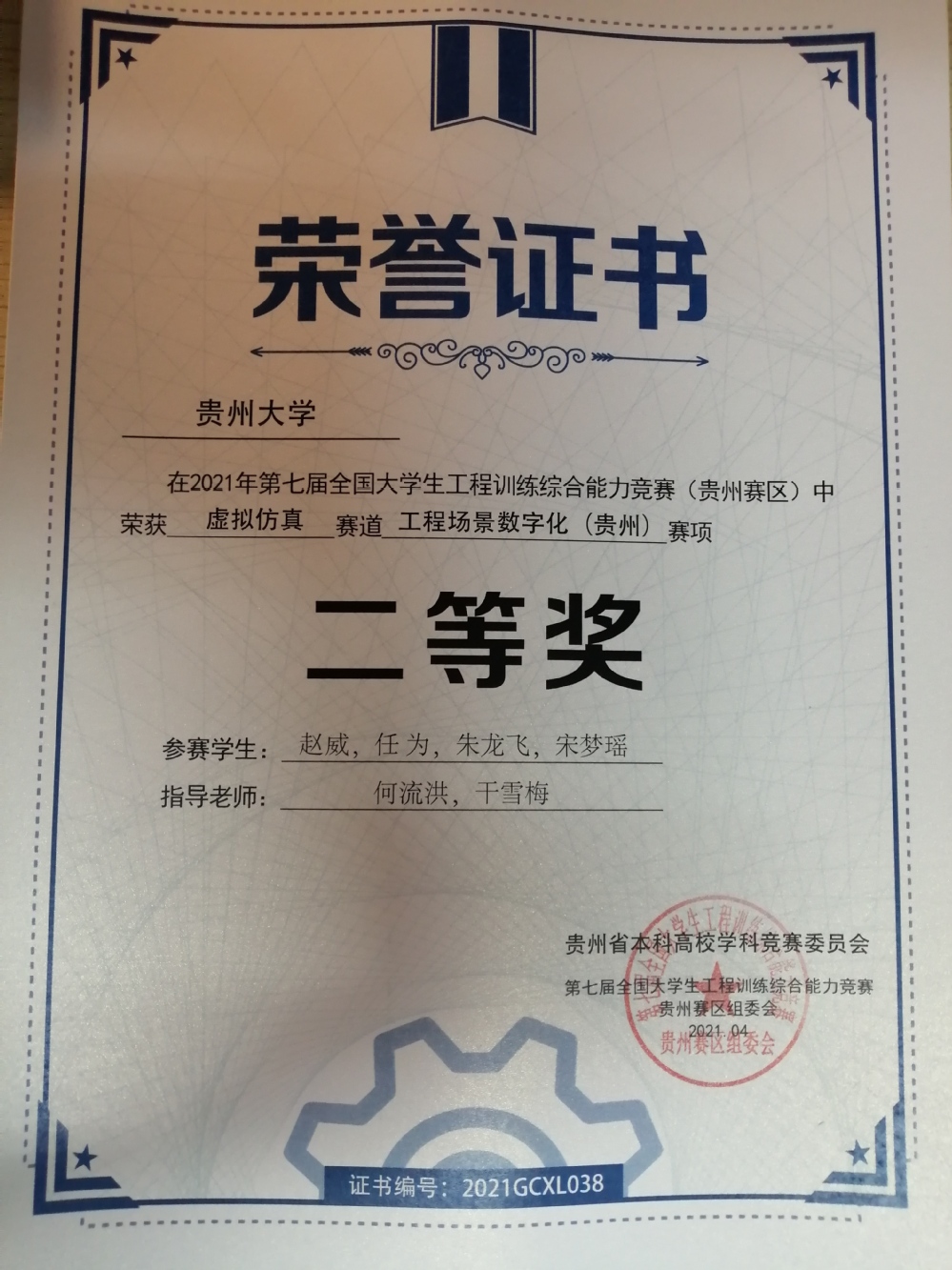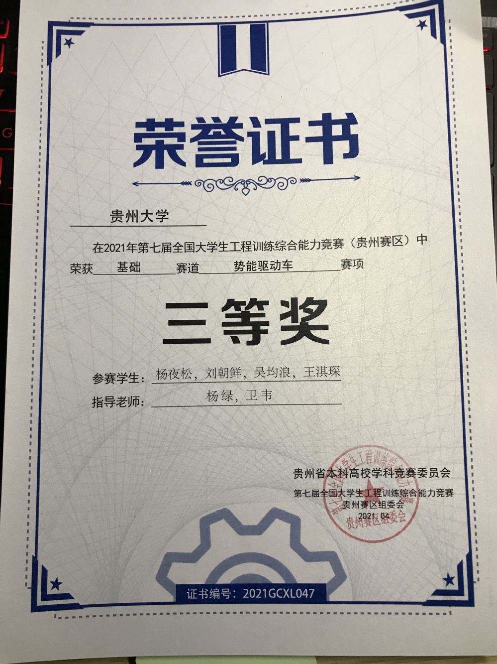 2021年工程训练大赛获奖证书(部分)